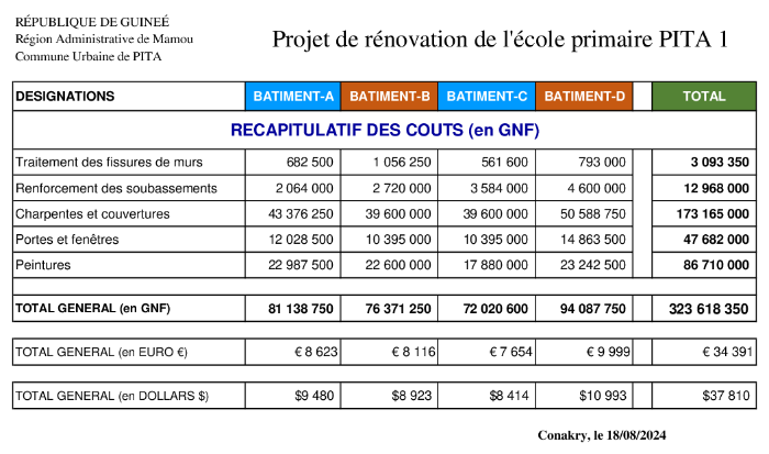 L’école primaire publique PITA 1 (République de Guinée) tombe en ruines dans l'indifférence totale. Les conditions de travail (du personnel) et d'étude (des élèves) sont aujourd'hui très précaires. Sans intervention urgente, l'école est condamnée à disparaître au grand regret de tous ceux qui n'ont pas les moyens d'aller vers le privé.